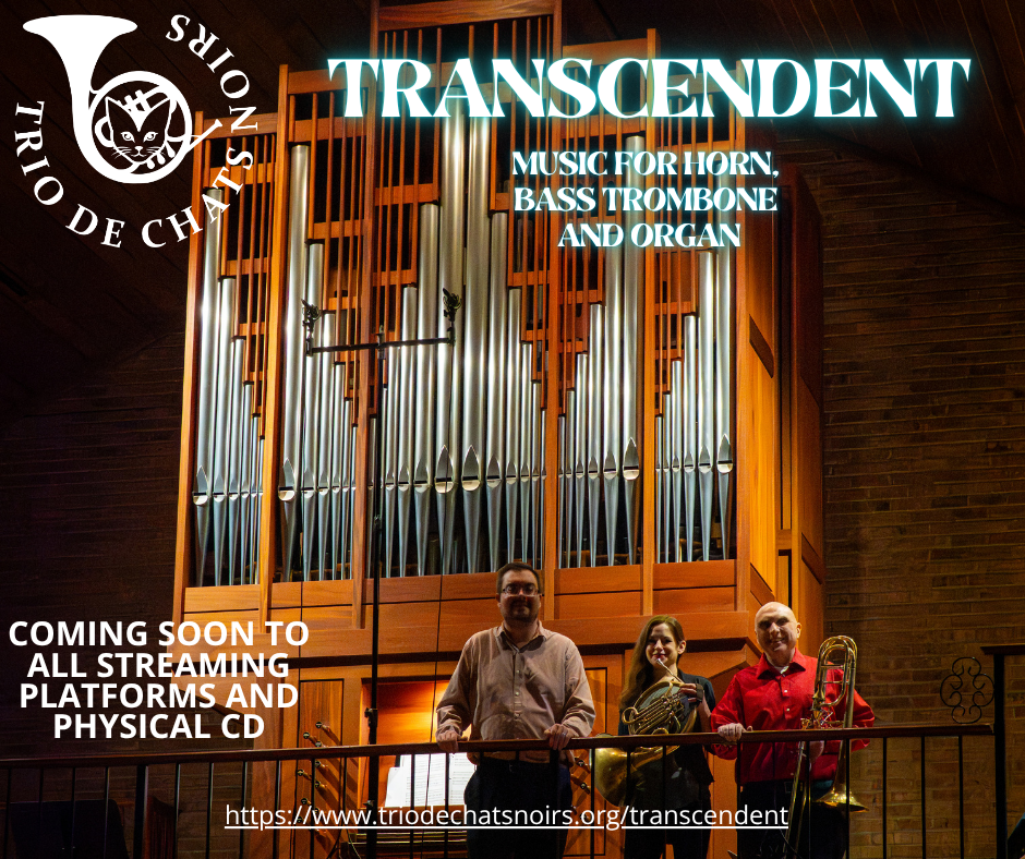 Trio de Chats Noirs - Rachel Velvikis (horn), Mark Fry (bass trombone), and organist Christopher Powell—is proud to announce the completion of our recording Transcendent: Music for Horn, Bass Trombone and Organ. The album was recorded in the beautiful sanctuary of Saint Giles Episcopal Church in Northbrook, IL, using the magnificent Hellmuth Wolff organ (Opus 37, 1994). This masterpiece—2 manuals and pedal, 19 stops/25 ranks, mechanical action, with classic French-inspired voicing and a striking solid mahogany double case—pairs perfectly with the warm, resonant acoustics of the space. The sessions were expertly captured by Keenan Recording, Chicago-based specialists in high-quality album and performance recording. Transcendent will be released soon to all major streaming platforms, with the physical CD following later this year.